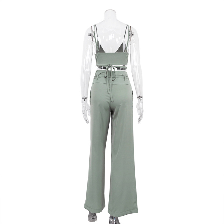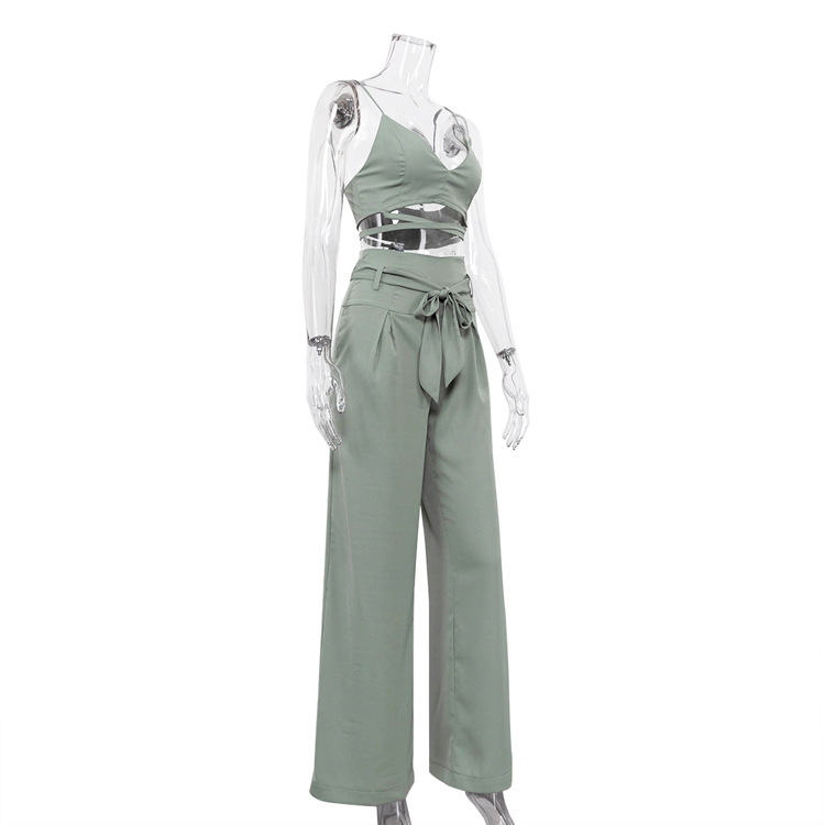 Sexy Crop-Top Spaghetti-Strap Top Casual High Waist Wide Leg Pants Two-Piece